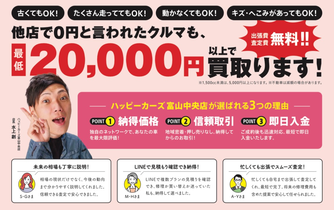 ハッピーカーズ富山中央店は、「地域密着・出張買取専門」のクルマ買取店です。